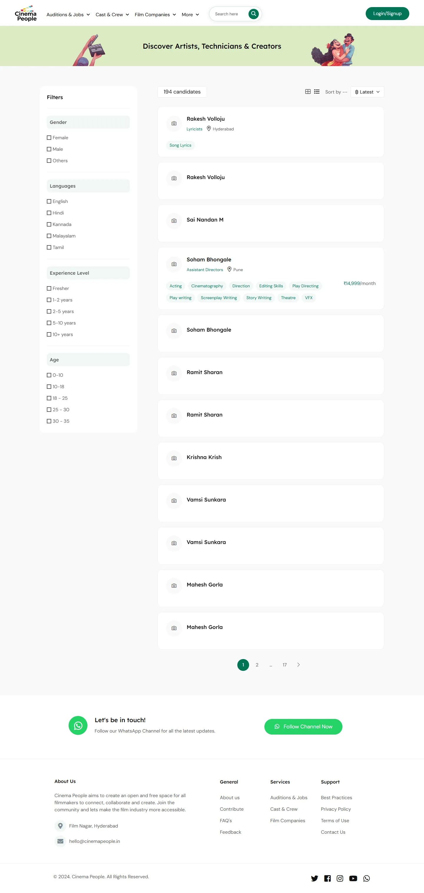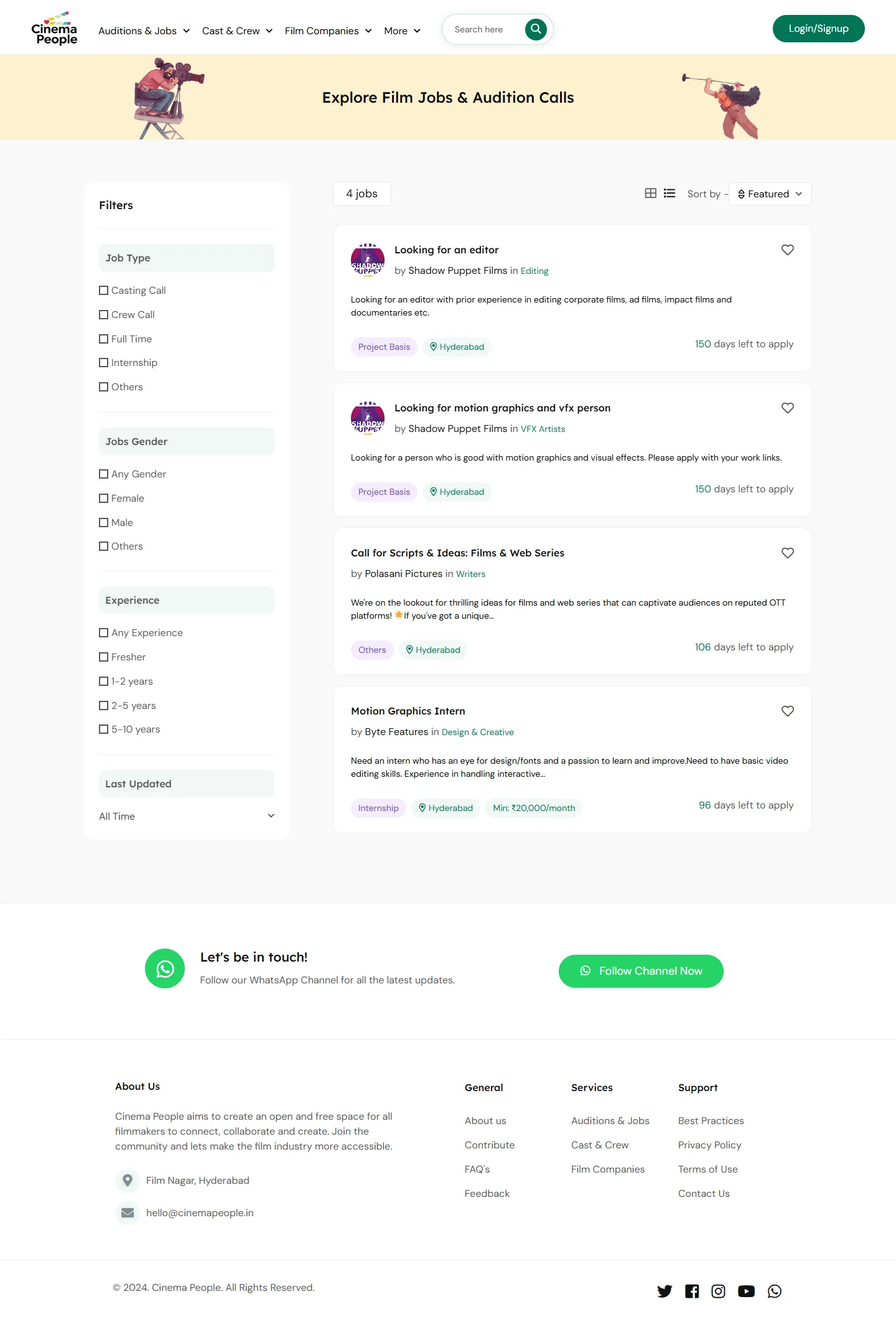 Cinema People is an online community and job portal dedicated to the Indian film industry. Connecting actors, directors, screenwriters, and film professionals with career opportunities.