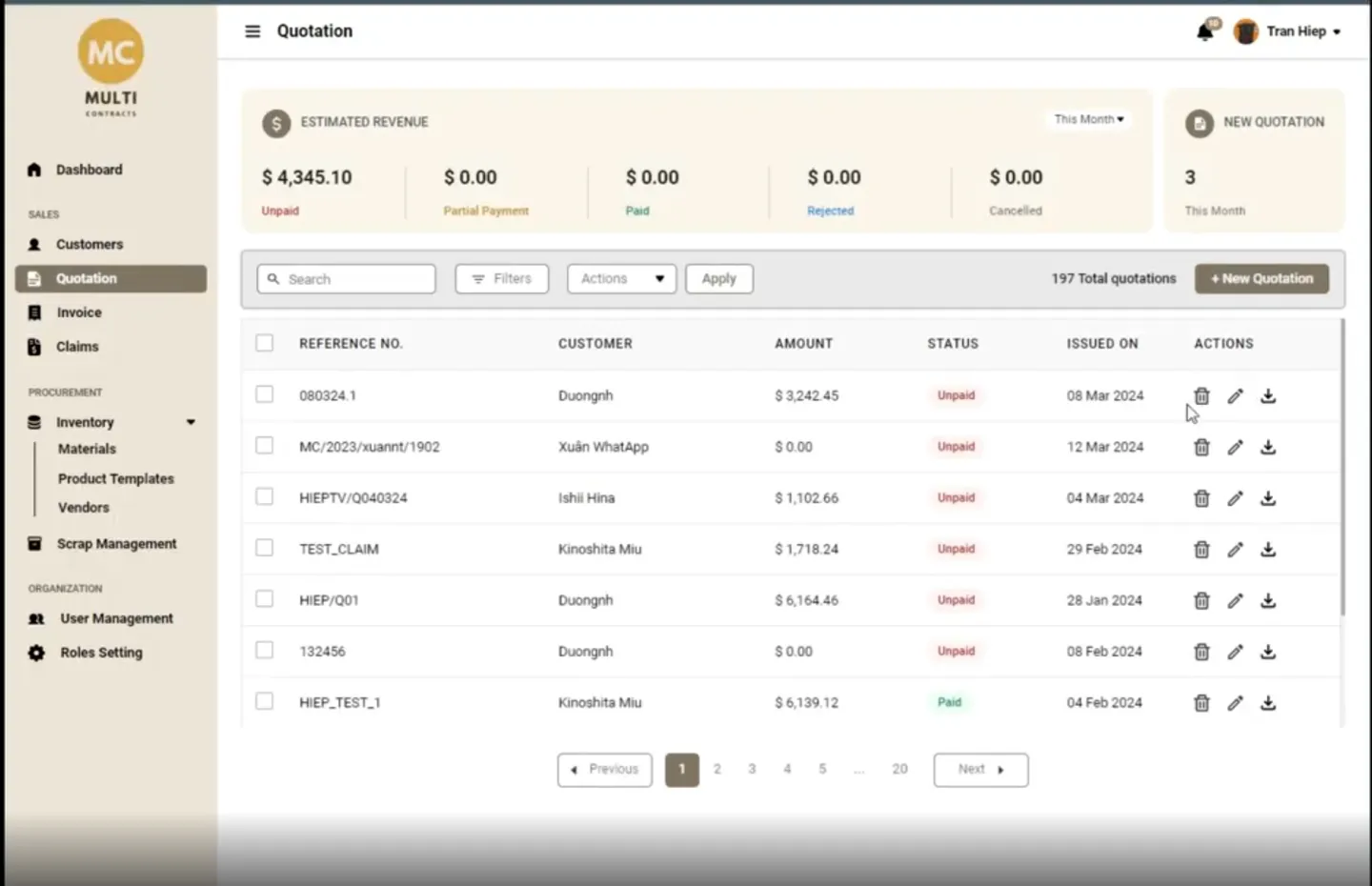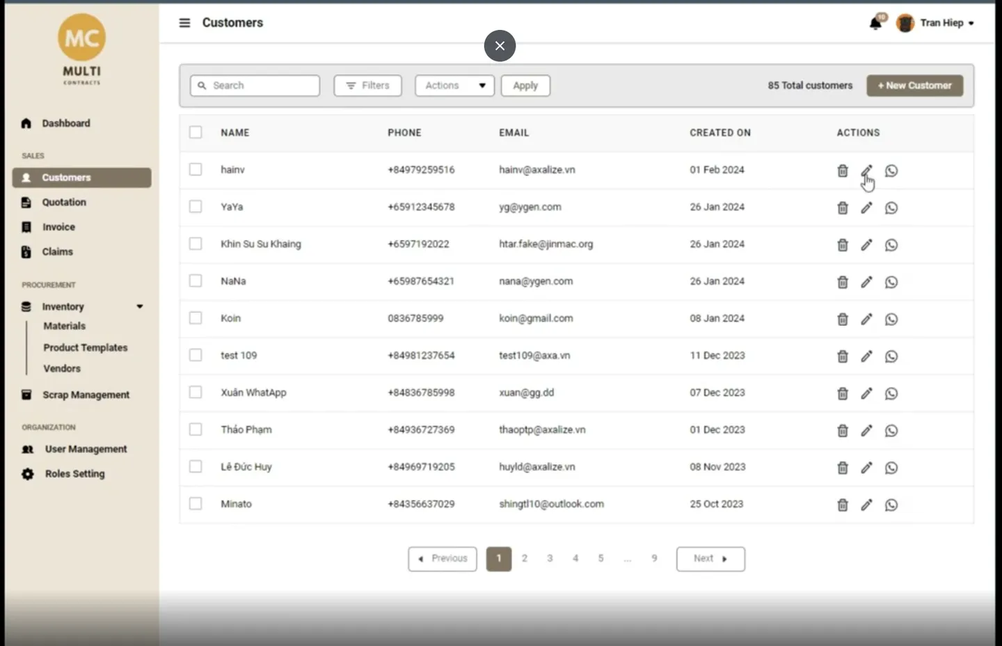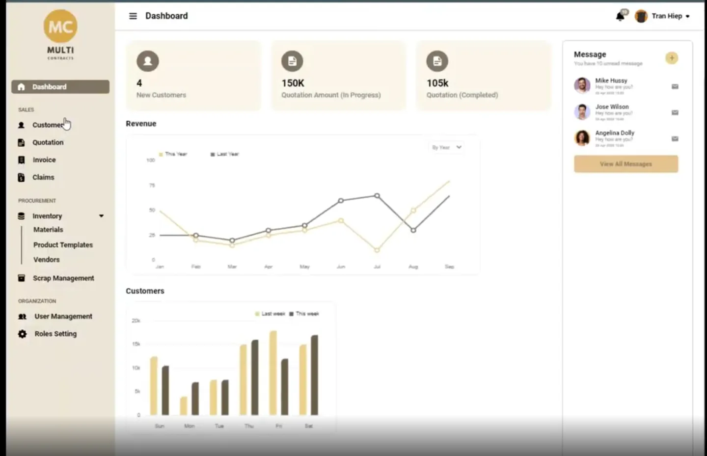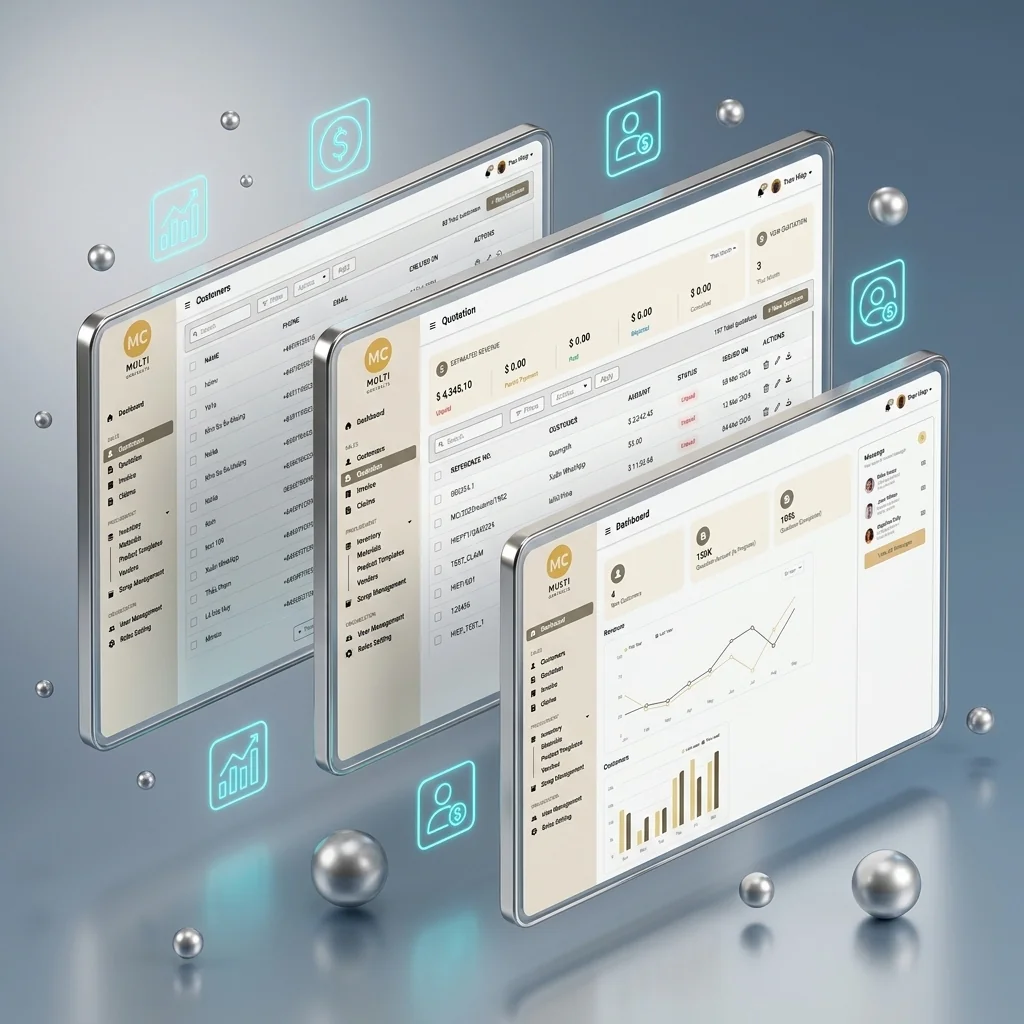MULTI-CONTRACTS is a CRM (Customer Relationship Management) system developed by Axalize Incorporated, specialized for managing contracts, customers, inventory, and business revenue. The system features a powerful Custom Dashboard, built on a ReactJS SPA architecture, integrating realtime chat via Pusher and utilizing Redux / Redux-Saga for state management, with Laravel on the backend.
