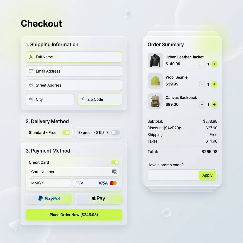 The #1 reason online stores lose sales is a complicated checkout. I redesign your cart-to-payment flow to remove every unnecessary step. Express checkout via Apple Pay and Google Pay, guest checkout without forced account creation, and strategic trust signals that eliminate last-minute hesitation.